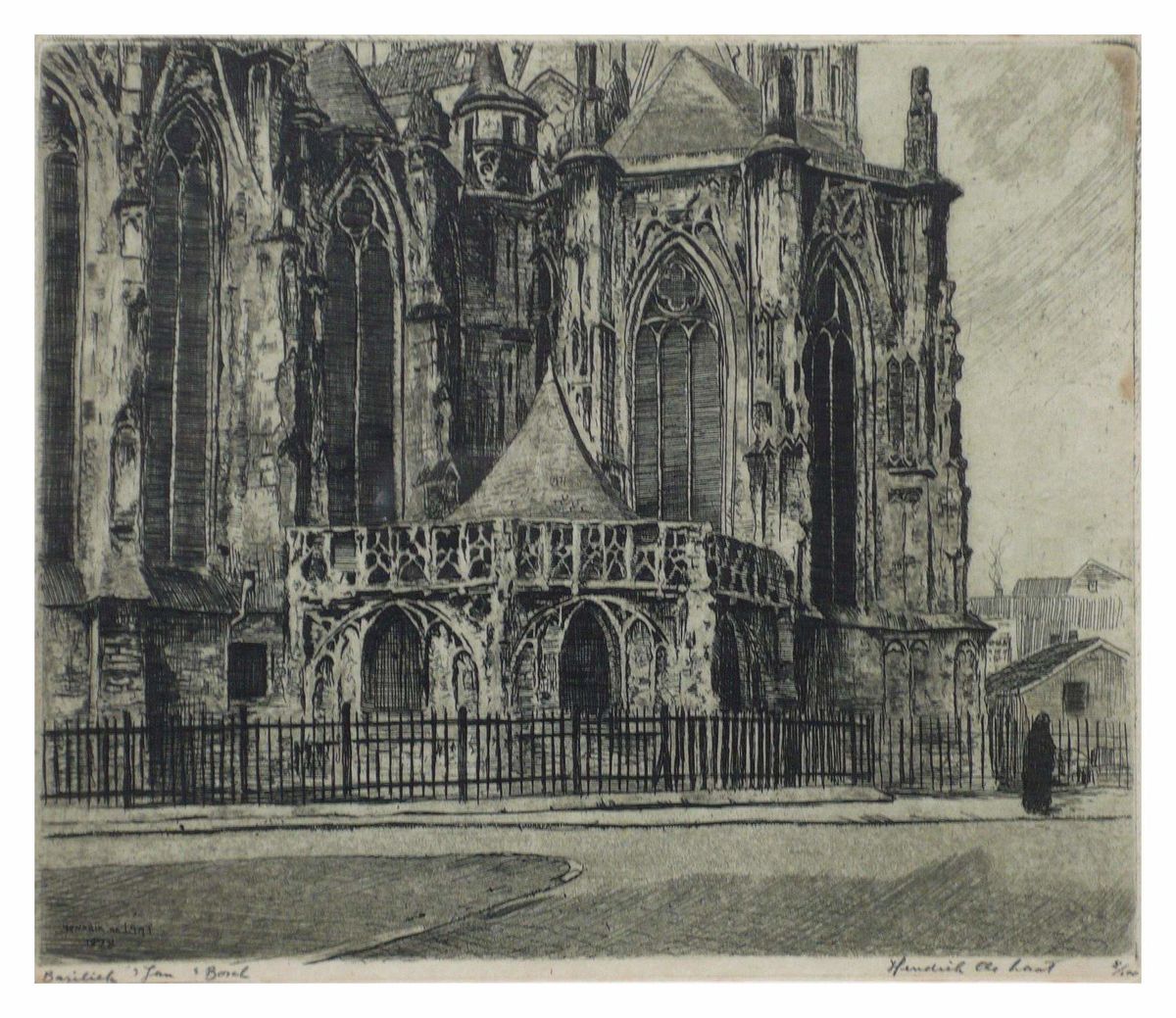 – Zicht op de St.Janskathedraal ets 18 X 21 cm